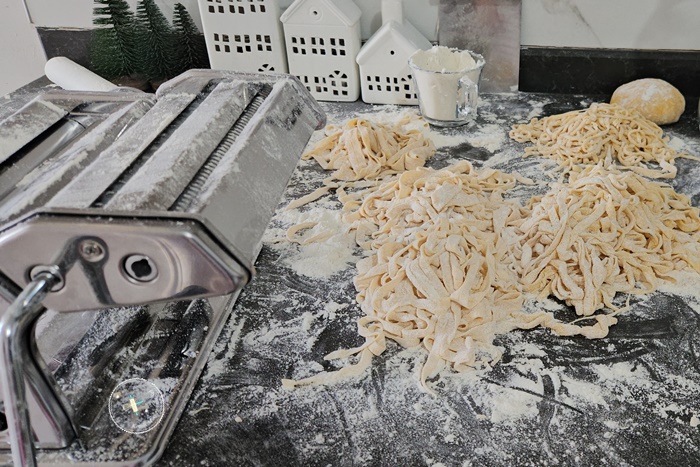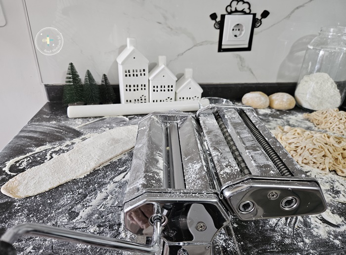 7. Hamuru merdane ile oval bir şekilde açıp, makarna makinesi ile inceltin.