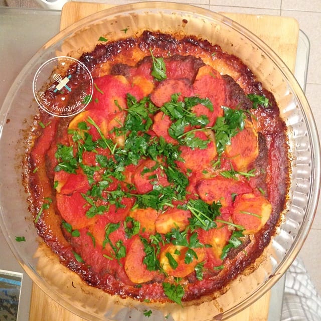 Orta boy borcamı yağladım. Köftemi içine yaydım.