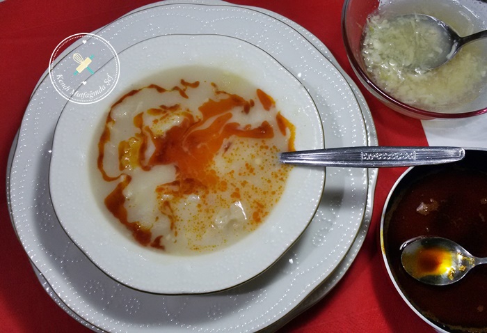 Geriye hazırlamak için, terbiyesi için un kavurması, sarımsaklı sirkeli sos ve üzerine dökeceğiniz yakılmış kırmızı biber kalır.