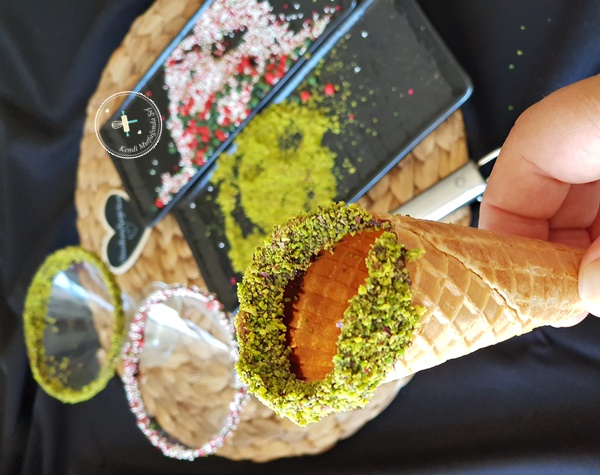 Külah ve kapların etrafını çikolataya batırarak, Antep fıstığı veya dekoratif şekerlerle süsleyebilirsiniz.
