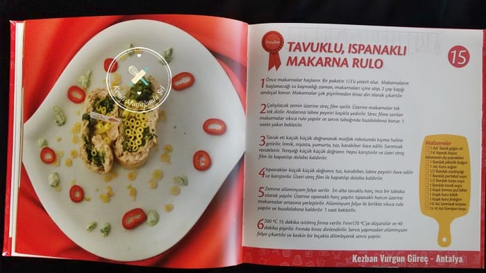 Kapı çalınıp kargo geldiğinde acaba nedir dedim. İçinden bu güzel kitap çıkınca çok sevindim. Yarışmaya katılan arkadaşlarımızın tarifleri ve benim de Tavuklu Ispanaklı Makarna Rulo Tarifim var.