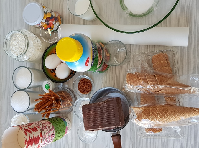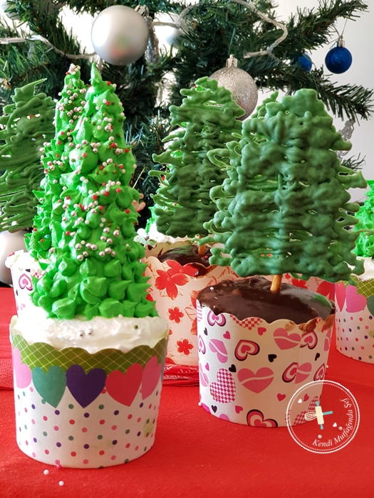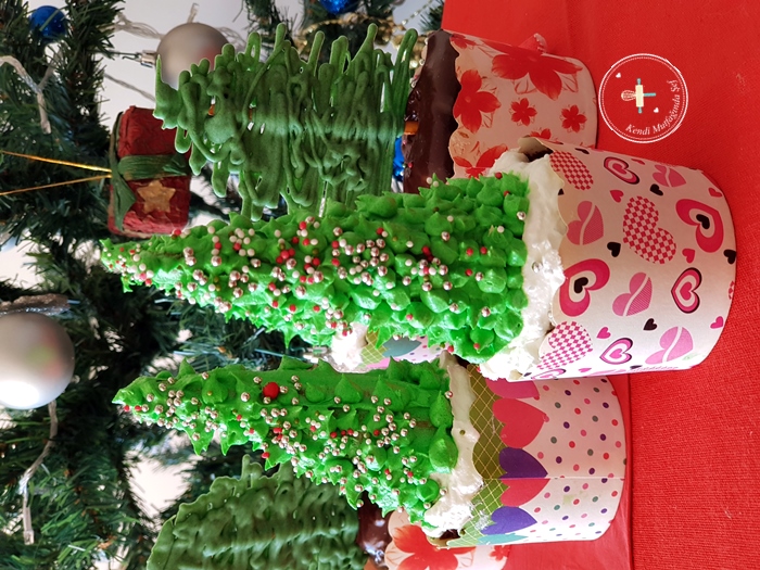 Bir kısmını da krem şantiyi renlendirip dondurma külahlarının üzerine ince yıldız duyla çam ağacı şeklini vererek hazırladım.