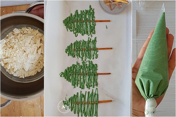 Süslemeleri için bir kısmını beyaz çikolayı eritip, renklendirip çubuk krakerlerin üzerine, çam ağacı şeklini verdim. Gıda boyasını çok kullanmıyorum. Sizlere de tavsiyem iyi kalite bir gıda boyası kullanmanız.